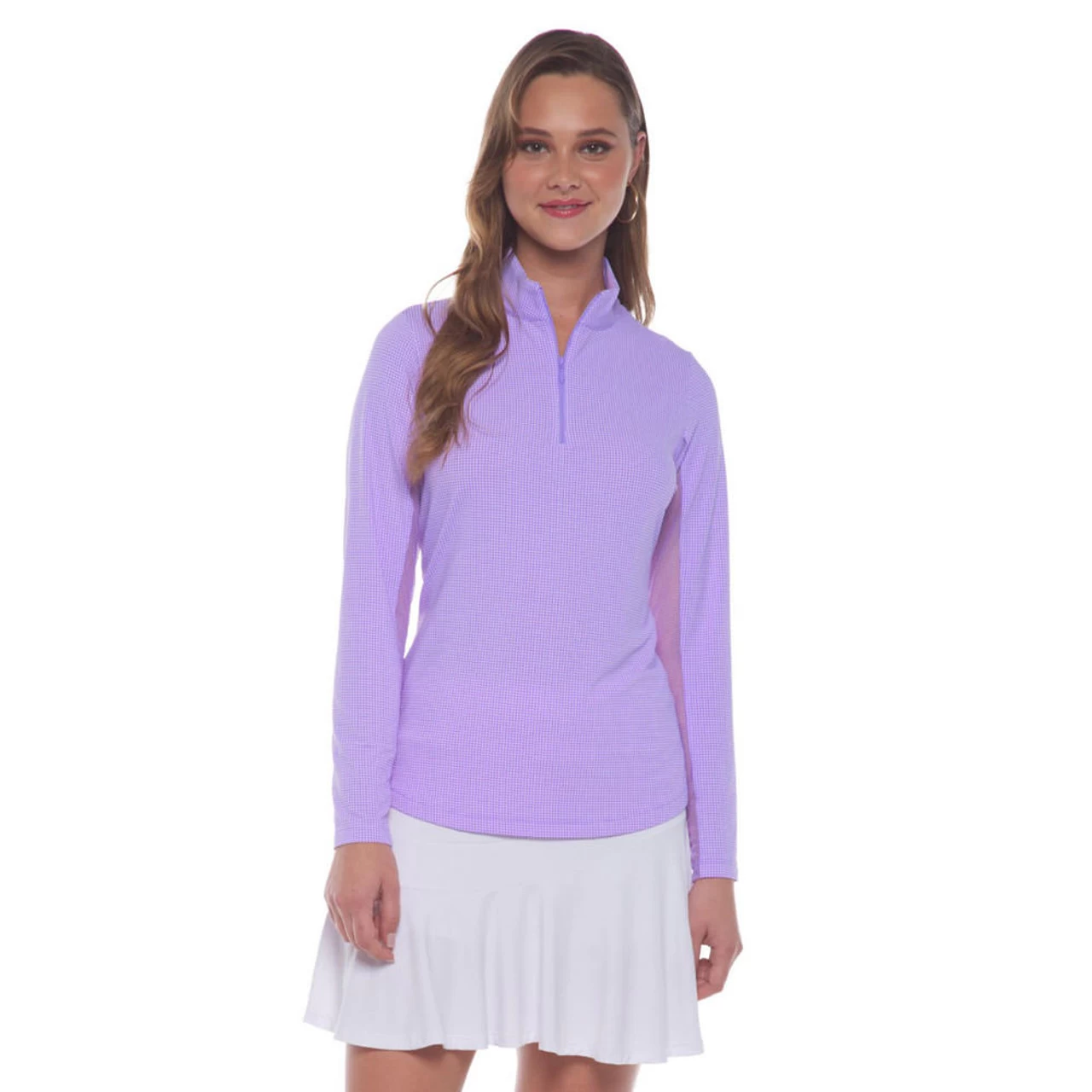The IBKUL Mini Check Long Sleeve Zip Mock is the ultimate piece of athleisure outer wear.  Featuring IBKUL’s patented IceFil Technology fabric, the Mini Check Long Sleeve Mock is engineered to convert sweat to refrigerant. Keeping the surface of the skin 3 – 5 degrees lower, IceFil fabric ensures a cooler, more comfortable experience on even the hottest days at the course. Possessing moisture-wicking and anti-microbial properties, the IBKUL Mini Check Long Sleeve Zip Mock is perfect for any occasion.